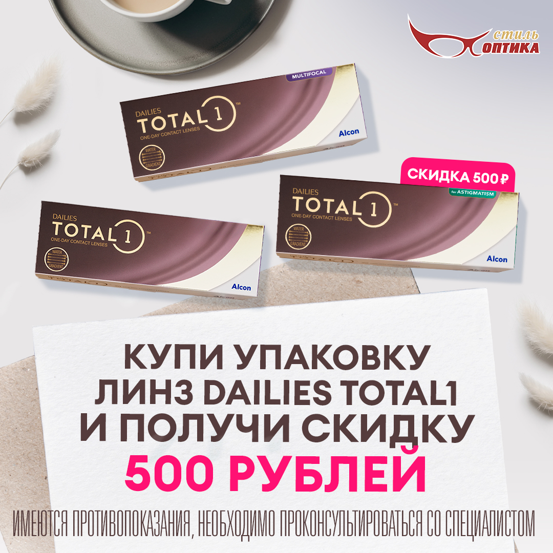 Скидка 500 руб. на контактные линзы Dailies Total1 (сферические , астигматические, мультифокальные) от компании ALCON, срок акции до 20.11.2025 г. Подробности в салонах Стиль Оптика.